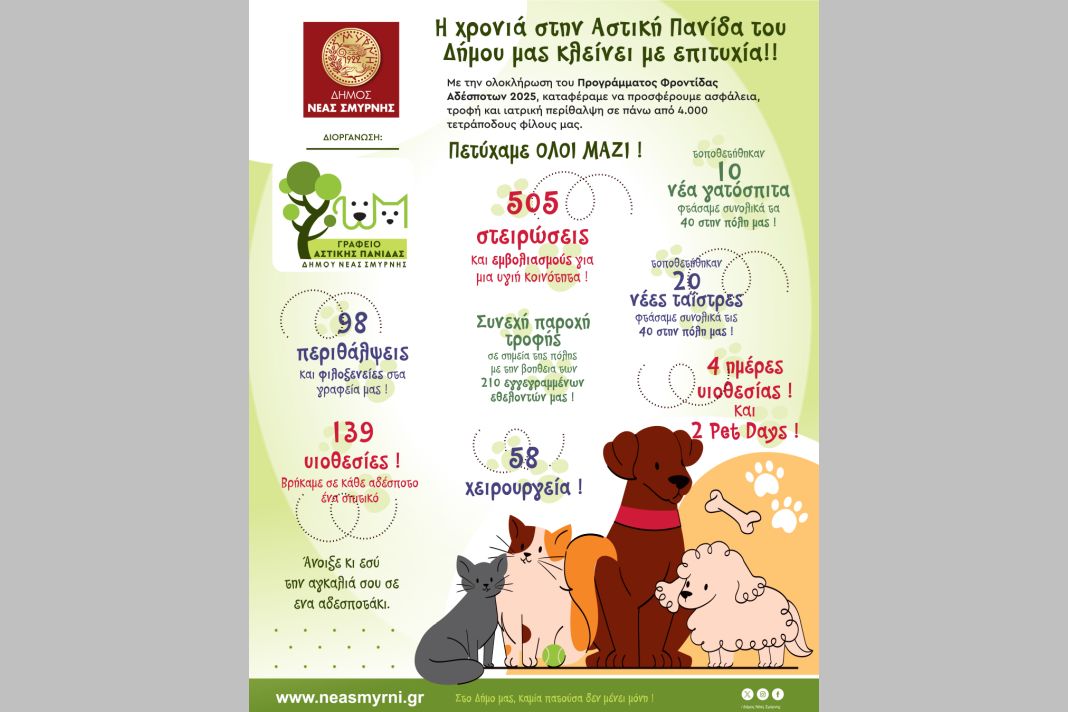 Σύμφωνα με τον απολογισμό του Γραφείου Αστικής Πανίδας, με την ολοκλήρωση του Προγράμματος Φροντίδας Αδέσποτων για το 2025, περισσότεροι από 4.000 τετράποδοι «κάτοικοι» της πόλης έλαβαν τροφή, ιατρική φροντίδα και προστασία. Κατά τη διάρκεια της χρονιάς πραγματοποιήθηκαν δεκάδες περιθάλψεις και φιλοξενίες, εκατοντάδες στειρώσεις και εμβολιασμοί, ενώ καταγράφηκαν και 139 υιοθεσίες. Παράλληλα, έγιναν 58 χειρουργικές επεμβάσεις, τοποθετήθηκαν νέα γατόσπιτα και ταΐστρες σε κομβικά σημεία της πόλης, ενώ οργανώθηκαν ημέρες υιοθεσίας και θεματικές φιλοζωικές δράσεις. Η σίτιση των αδέσποτων συνεχίζεται σε σταθερή βάση σε επιλεγμένα σημεία της Νέας Σμύρνης, με τη συμβολή 210 εγγεγραμμένων εθελοντών, που αποτελούν βασικό στήριγμα του προγράμματος.