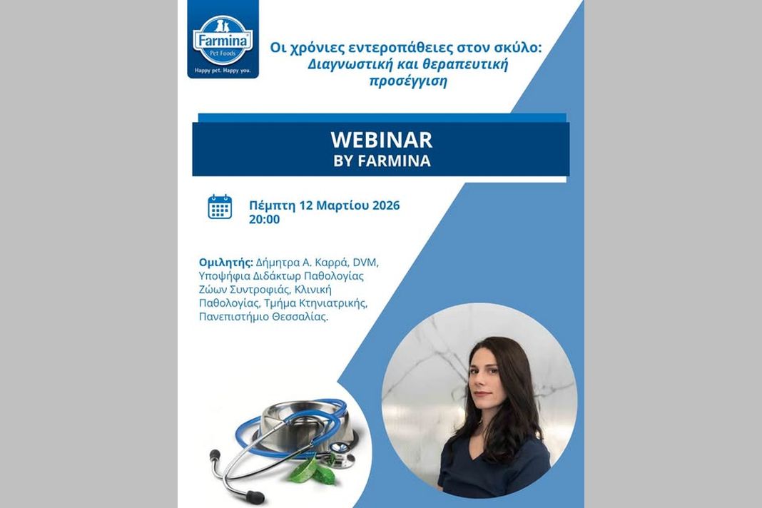 Έτσι το Farmina Genius Academy προσκαλεί στις 12 Μαρτίου 2026 στις 20:00 τους ενδιαφερόμενους σε ένα εξειδικευμένο webinar με θέμα “Χρόνιες Εντεροπάθειες στο Σκύλο: Διαγνωστική και Θεραπευτική Προσέγγιση”, όπου θα παρουσιαστούν οι πιο σύγχρονες προσεγγίσεις και τα πρωτόκολλα αντιμετώπισης. Εισηγήτρια θα είναι η Δήμητρα Α. Καρρά, DVM, Υποψήφια Διδάκτωρ Παθολογίας Ζώων Συντροφιάς, Κλινική Παθολογίας, Τμήμα Κτηνιατρικής του Πανεπιστημίου Θεσσαλίας, η οποία διαθέτει σημαντική εμπειρία στη διάγνωση και τη θεραπεία σύνθετων γαστρεντερολογικών περιστατικών.